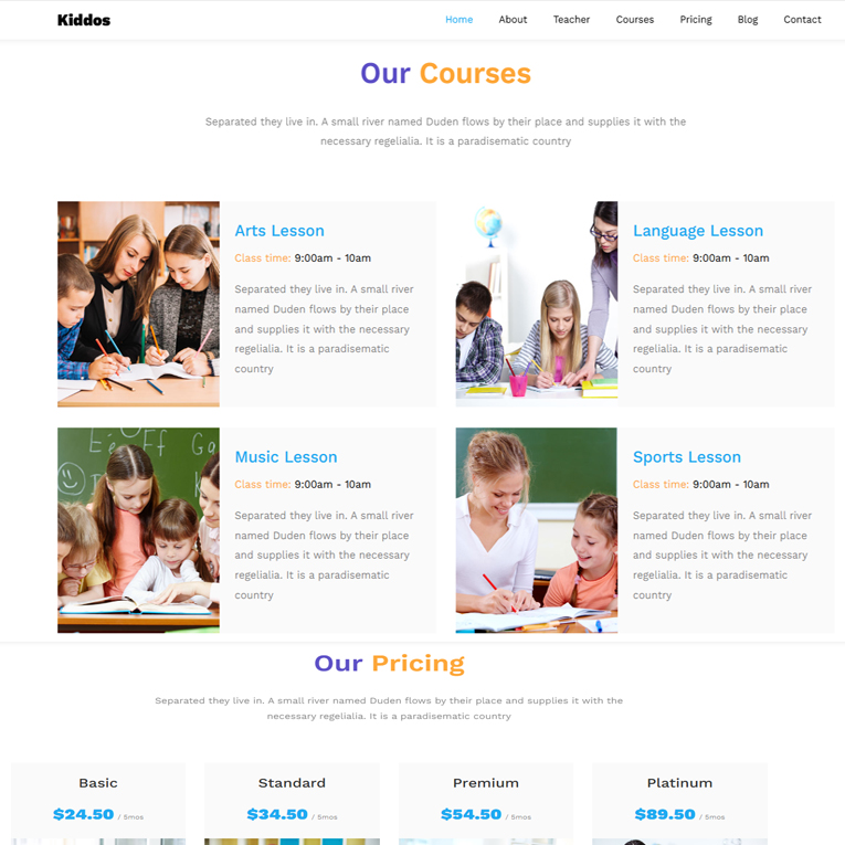 Kiddos هو قالب موقع ويب تعليمي بتقنية HTML5 يعتمد على أحدث إطار عمل Bootstrap 4. إنه عبارة عن لوحة ألوان جذابة تناسب مواقع الويب مثل المدارس والكليات ورياض الأطفال ودليل الدورات التدريبية عبر الإنترنت وما إلى ذلك. علاوة على ذلك، يأتي Kiddos مع قالب متعدد الصفحات ومتجاوب بالكامل . كما أنه مُحسَّن لأقصى حد من المتصفحات. Template Kiddos –HTML5 Bootstrap 4 Education Website