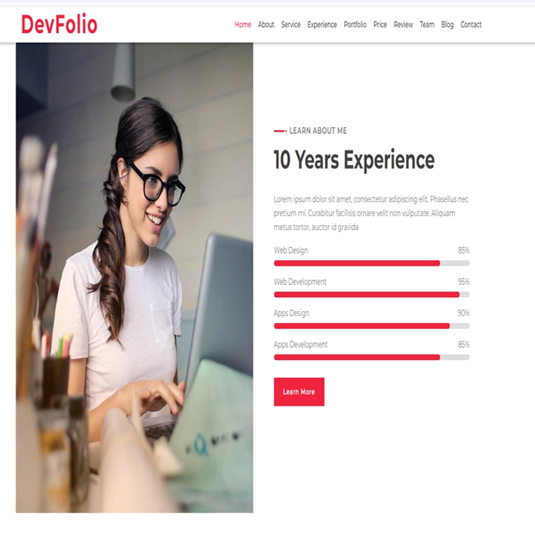يتيح لك هيكل الموقع الإلكتروني المثير للإعجاب المكون من صفحة واحدة عرض كل جزء من سيرتك الذاتية في بضع تمريرات فقط. يحتوي DevFolio على العديد من الميزات المتميزة مثل رأس البطل وشريط التنقل العلوي اللاصق وتأثير الآلة الكاتبة وشريط التقدم والجدول الزمني وزر العودة إلى الأعلى وجدول الأسعار والمزيد. إذا أردت، يمكنك استخدامه مباشرة بعد إخراجه من الصندوق. يمكنك حتى إجراء التعديلات والتغييرات عليه دون أي جهد. أخيرًا، مع DevFolio، لا يمكن أن تخطئ محفظتك الإلكترونية أبدًا.